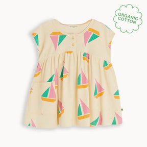 استعدوا للصيف مع المزيج المثالي من الراحة والجاذبية! فستان تايا الصيفي مصنوع من قطن عضوي ناعم وقابل للامتصاص بتصميم تيري، ويتميز بطبعة قارب شراعي بألوان الوردي والأخضر والبرتقالي.