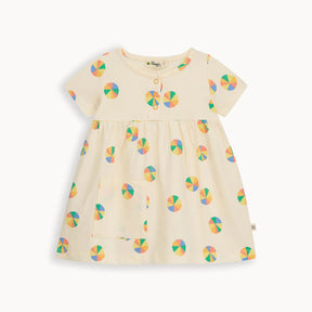 >فستان صيفي مريح بأكمام قصيرة للأطفال والرضع بقاعدة كريمية مع طباعة مظلة قوس قزح. قطن عضوي ناعم ومرن وجيد التهوية، ورقبة دائرية، وفتحة بزر كبس لسهولة الارتداء، وجيب. مصنوع بحب في مصنع معتمد من GOTS للراحة والمتانة.