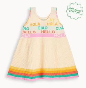 استقبلوا الصيف بأناقة مع فستان باريس المحبوك. يتميز بتصميم "HELLO" الجاكار المرح بألوان قوس قزح، مصنوع من قطن عضوي ناعم وقابل للتهوية ليحافظ على راحة طفلك طوال الصيف.