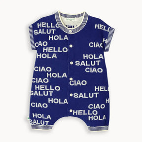 استعدوا للعب مع بلاي سوت الأطفال المحبوك المصنوع من قطن عضوي فاخر! يجمع هذا التصميم بين الراحة والأناقة بفضل نقش "HELLO" الجاكار المرح باللون الكحلي والكريمي، مما يجعله هدية مثالية للمولود الجديد للجنسين.
