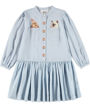 فستان فيسكوز أزرق فاتح جميل. يحتوي الفستان على أزرار رائعة في الأمام، جيبين، وتنورة دائرية ملحقة، بالإضافة إلى إغلاق بالأزرار عند الأكمام. يتضمن الفستان طباعة لحيوانات لطيفة بالقرب من الأزرار، وكذلك في الجيوب.