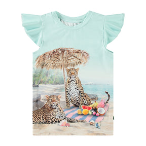 راشغارد للأطفال النشطين مصنوع من البوليستر المعاد تدويره مع حماية من الأشعة فوق البنفسجية +50. يتميز بقصة عادية، وياقة مرتفعة، وأكمام قصيرة مع كشكش. يأتي باللون الأزرق الفاتح مع طبعة فهود على شاطئ استوائي.