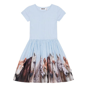 فستان أزرق بأكمام قصيرة وتنورة دائرية من القطن العضوي. الجزء العلوي من قماش الجيرسي المضلع وذو ملاءمة محكمة، بينما التنورة من قماش البوبلين القطني مع طبعة خيول بدرجات اللون البني والأبيض.