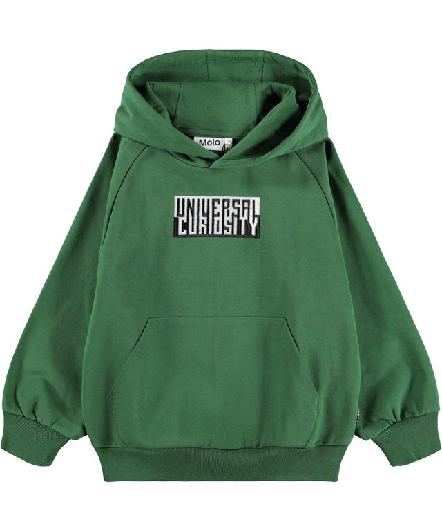 Green hoodie made of organic cotton with a kangaroo pocket and ribbed cuffs and hem. This hoodie has a black/white print with the text ''Universal Curiosity''.