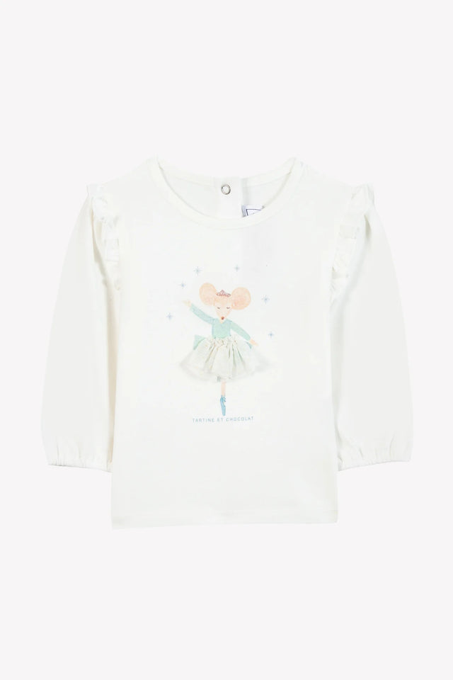 This T-shirt long ecru sleeves for Baby girl, adorned with a Illustration poetics of a mouse in a classical dancer, brings a touch of softness and lightness to the guardDress winter. Made in a soft material, it ensures optimal comfort for small explorations of Baby. Easy to associate with a Short in tweed or a Legging, He creates an elegant and warm outfit for winter.