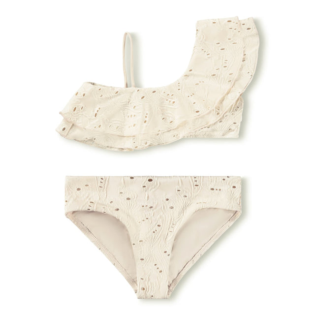 Stretchy bikini in white broderie anglaise, made from recycled polyester with UV protection 50+.