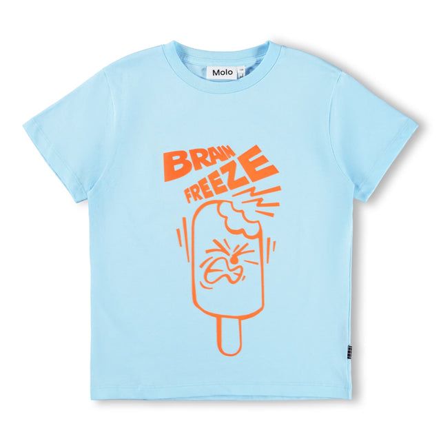The T-shirt has a loose fit and an orange print with ice cream and the text "Brain Freeze".