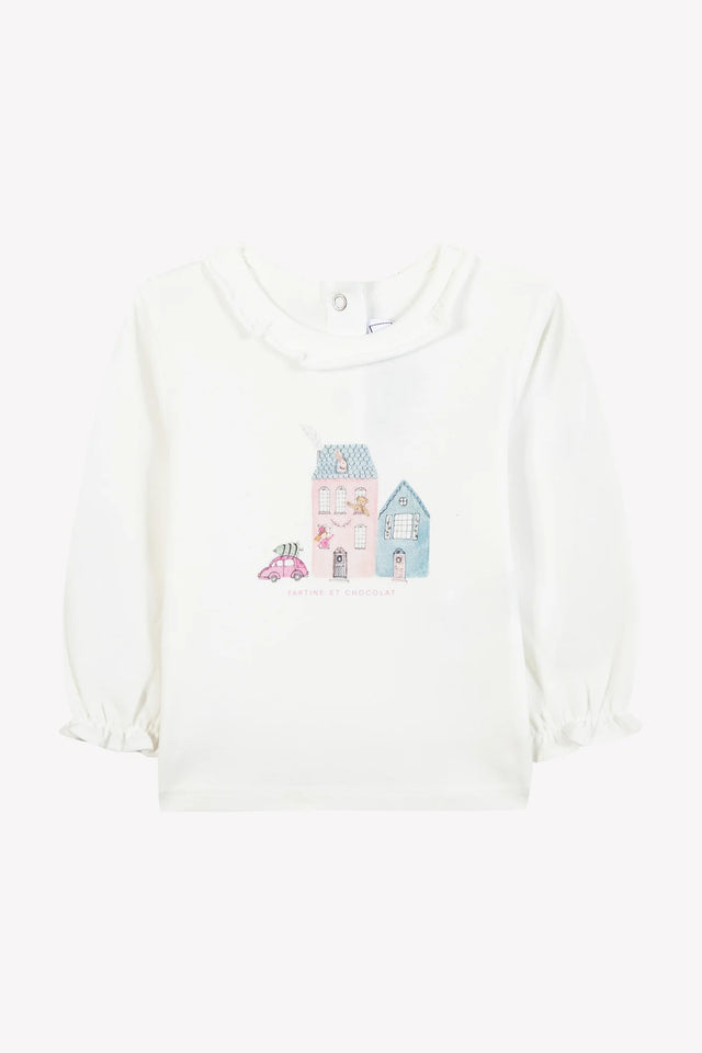 This T-shirt long ecru sleeves for Baby girl seduced by its charming flying at the level of the Collar and Bottoms sleeves, bringing a touch of délicatesse at its design. Her Illustration Poetics representing a country house in plum shades evokes sweetness and reverie. Made in a soft material to ensures optimal comfort.