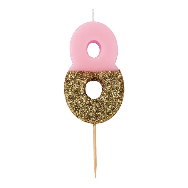 Pink number 8 birthday candle dipped with glitter by Talking Tables.